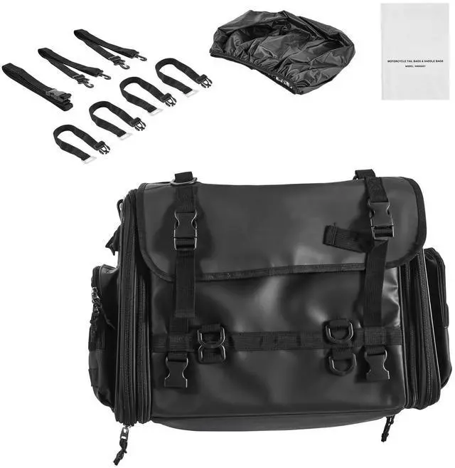 L Large Capacity: 12.6 in wide and high, our tail bag expands from 17.3 in to 23.6 in per side. It holds a folding tent, riding gear, food, raincoat, and bottle. Multiple interior compartments organize wallets, documents, and charging cables