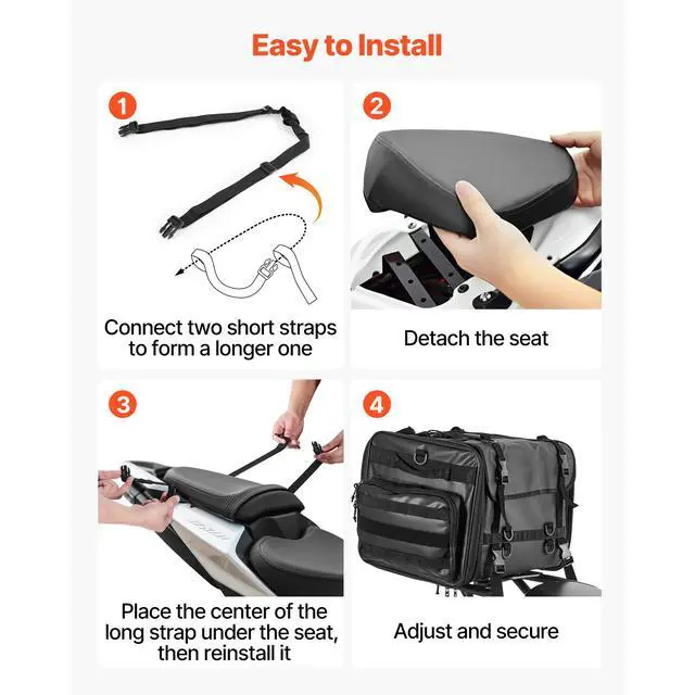 Fit Most Motorcycles: This motorcycle tail bag is designed to fit most motorcycles, including touring, standard, cruiser, and dirt bikes. It installs quickly using four straps secured under the rear seat, providing a stable and non-slip hold 40-60