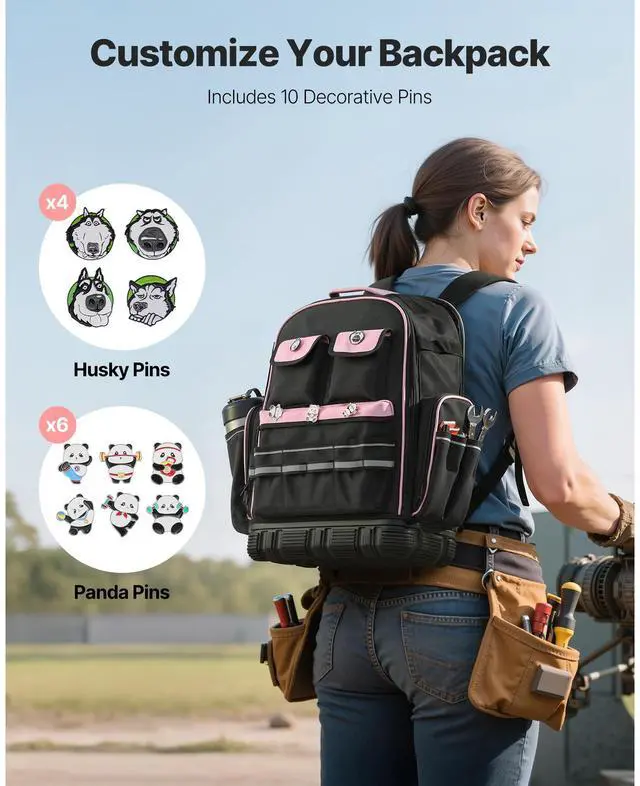 Fun Pins: Express your style! The electrician jobsite backpack includes 10 fun pins4 Husky and 6 Pandaso you can create a unique look. Stand out while working with a backpack that reflects your personality