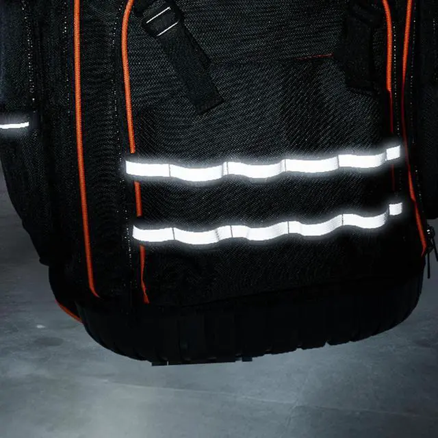 Pockets: This 2-in-1 tool backpack has 2 main compartments with space for up to 110 lbs of tools. It includes 51 pockets, a detachable compartment with 21 pockets, and 3 elastic straps for organization. The bright orange lining ensures you quickly find what you need, keeping everything secure and organized Built to