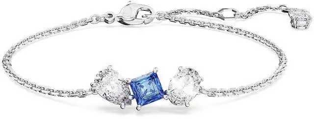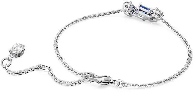Accented with a vibrant flourish of color this Mesmera bracelet is ready to impress. The rhodium plated design is worn on a delicate chain with a hanging elongation and features a trio of prong-set Swarovski Zirconia in varying shapes including a central square stone in bright blue. A bold mix of cuts that would make a wondrous gift. Length (minimum - maximum)- 6 1/8 - 7 5/8 inch. Motif size- 1/4 x 3/4 inch.