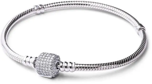 The classic sterling silver PANDORA charm bracelet is updated with a barrel clasp encrusted with sparkling stones. Use it as a dazzling carrier for your personal edit of charms and accentuate its glamorous appearance by adding a selection of PANDORAs popular pave charms.