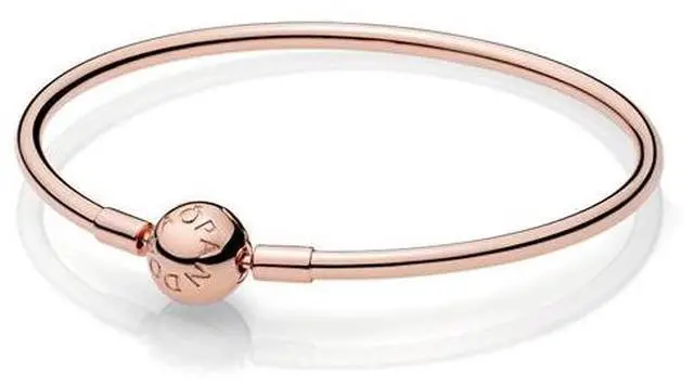 The simple things in life often are the greatest gifts. Like this minimalist bangle carefully crafted from Pandora Rose - our unique metal blend plated with 14k rose gold. The sleek style is stamped on the ball clasp with our logo - a subtle way to channel the trend. Adding polished edge to any look try using silicone-lined clips to space out charms or dare to bare and wear it solo.