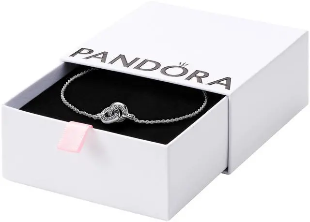 Build your look around the Pandora Signature Intertwined pave Chain Bracelet. Crafted in sterling silver this chain bracelet features a pair of intertwined moveable circles accentuated with a row of sparkle and microbeads in their centres. While they are the same size one features a polished back and the other an engraved back with two Pandora logos. An essential style in every collection this easy-to-wear piece is set to become your most-worn style to date.