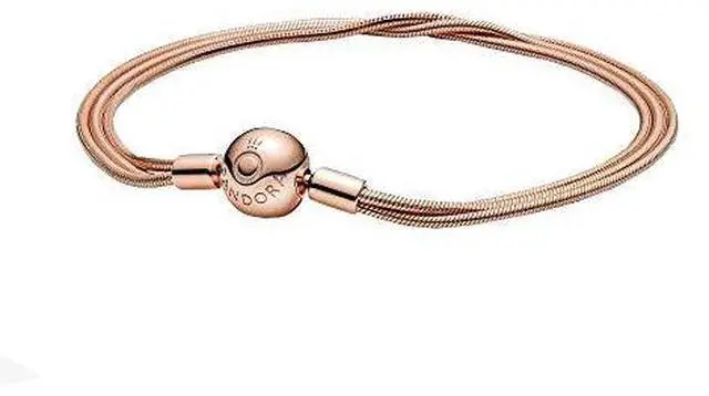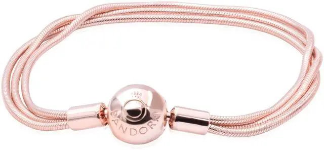 Add a metallic twist to your wrist with the Pandora Moments Multi Snake Chain Bracelet. Hand-finished in Pandora Rose (14k rose gold-plated unique metal blend) this warm-toned bracelet features three thin snake chains and a ball-shaped clasp featuring the iconic Pandora logo and monogram. Load up this snake chain bracelet with your favourite Pandora Moments charms which can be styled the same way as on a regular Pandora Moments bracelet for a modern yet classic look.