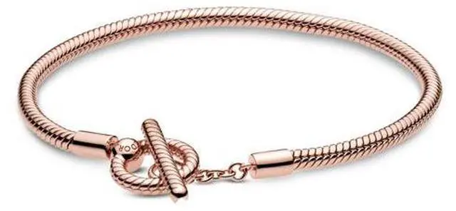 Expand your collection with the Pandora Moments T-Bar Snake Chain Bracelet. Hand-finished in Pandora Rose (14k rose gold-plated unique metal blend) this piece is an updated take on the Pandora Moments snake chain bracelet. Featuring a T-bar double circle closure loop the T-bar through the smallest circle to guarantee that the bracelet clasp is securely closed. Including a snake chain pattern on the rigid parts of the bracelet wear this piece with up to 15-20 Pandora Moments charms and dangles.