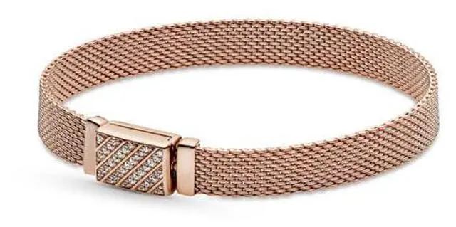Add some sparkle to your look with the Pandora Reflexions Long Clasp Pave Bracelet. Featuring an elongated clasp shape with diagonal rows of clear cubic zirconia Pave on the front and a polished back with Pandora logo this fine flat mesh bracelet is hand-finished in Pandora Rose (14k rose gold-plated unique metal blend). Designed in the modern minimalist aesthetic of Pandora Reflexions this warm-toned bracelet is a sleek stunning and sophisticated addition to any look.