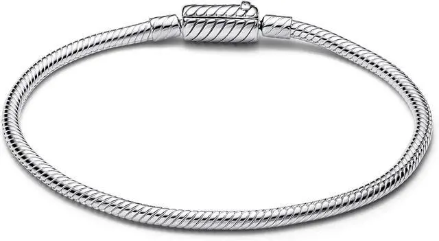 Meet the Pandora Moments Sliding Magnetic Clasp Snake Chain Bracelet. Our sterling silver snake chain bracelet gets an update with a new magnetic clasp making it even easier to put on and style with your favorite charms. The magnetic clasp clicks shut with ease and a sliding piece holds it securely in place. The snake chain texture continues on the clasp for a sleek streamlined look. Style it with up to 16-18 Pandora Moments charms or dangle charms.