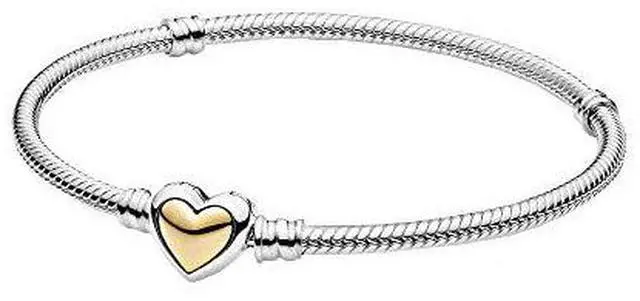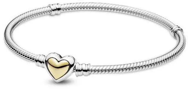 Make your loved one feel extra special with the Domed Golden Heart Clasp Snake Chain Bracelet. Hand-finished in sterling silver this design features a heart-shaped clasp with a slightly domed 14k gold heart centre. The clasp has a plain polished look for a subtle effect. Featuring our popular snake chain this bracelet includes threaders and stoppers to keep much-loved charms in place. Surprise someone special with this heartfelt piece as a symbol of your affection.