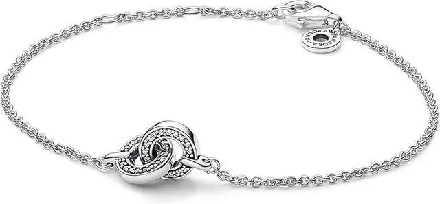 Build your look around the Pandora Signature Intertwined pave Chain Bracelet. Crafted in sterling silver this chain bracelet features a pair of intertwined moveable circles accentuated with a row of sparkle and microbeads in their centres. While they are the same size one features a polished back and the other an engraved back with two Pandora logos. An essential style in every collection this easy-to-wear piece is set to become your most-worn style to date.