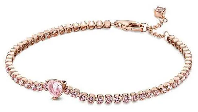 Bring elegance to your outfit with the Sparkling Pave Tennis Bracelet. Hand-finished in our 14k rose gold-plated unique metal blend this tennis bracelet is decorated with sparkling orchid pink man-made crystals. A large central heart-shaped stone punctuates a row of evenly sized pave. The bracelet includes a lobster clasp for safe closure and can be adjusted to three lengths. Style it with other shimmering Pandora Timeless pieces for a classic look that stands out.