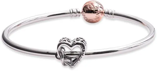 Wrapped in infinity symbols and designed with cute cutout hearts all around the sterling silver engraved Love You Mom charm serves as a unique standout accent to our classic sterling silver bangle with Pandora Rose Clasp. She will enjoy adding more symbols of love to this heartfelt bracelet and always remember how special it makes her feel. It comes ready for gifting in our new large Pandora gift box.
