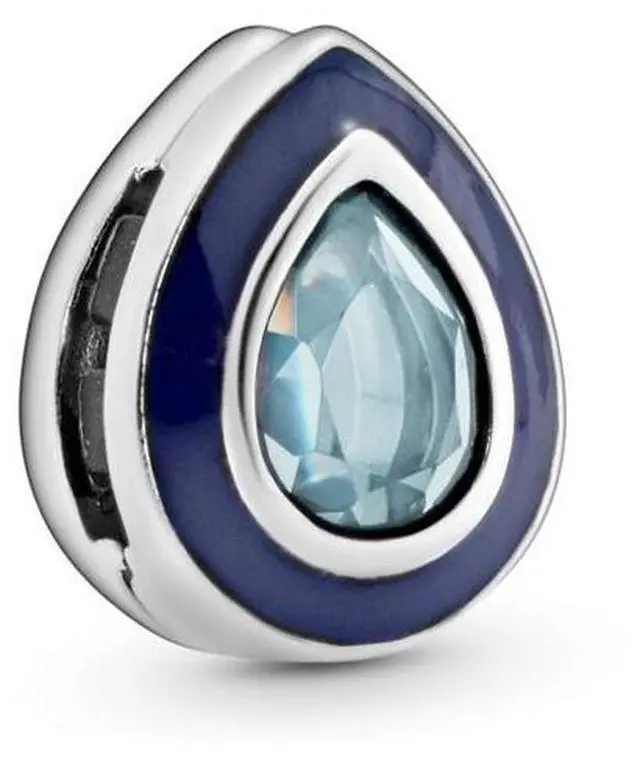 Pandora Reflexions drop clip charm in sterling silver with 1 bezel-set pear brilliant faceted with flatback moonlight blue crystal and true nave enamel.