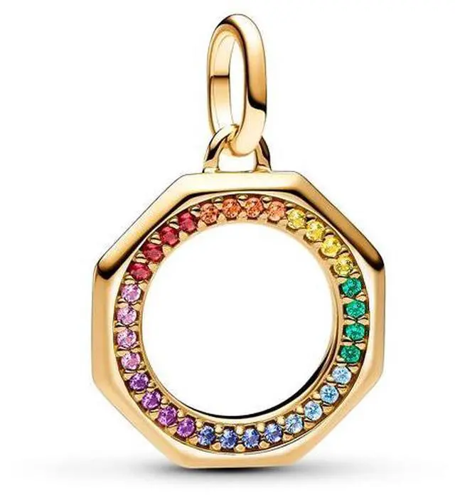 Energize your look and your vibe with the Pandora ME Rainbow Medallion Charm. Crafted in our 14k gold-plated unique metal blend this octagon-shaped charm features a rainbow-hued row of sparkling stones in green pink light blue dark blue red purple orange and yellow on one side. On the other side is an engraved message that reads- The future is now and in my power. Wear this piece as a symbol of positive self-expression. Can only be styled on openable links.