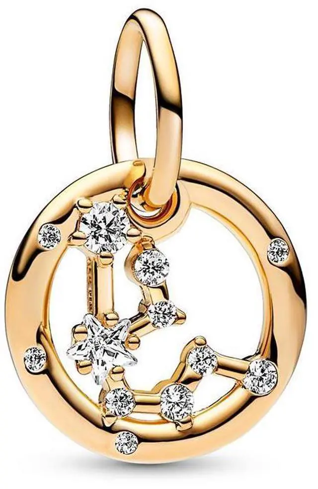 Let the stars guide your look with the Pandora Aquarius Zodiac Dangle Charm. The dangle is crafted our 14k gold-plated unique metal blend has a circular outer frame and features clear sparkling cubic zirconia as well as the shape of the Aquarius zodiac sign. The back side of the frame is engraved with Aquarius. Unique altruistic and innovative the Aquarius in your life can always be counted on to bring about change with optimism. Wear this Pandora Moments Dangle Charm as a sign of your own signs strength or give it as a gift of appreciation to the Aquarius in your life.