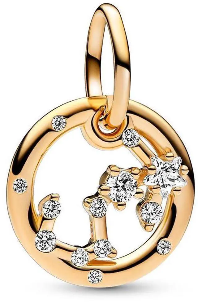 Let the stars guide your look with the Pandora Scorpio Zodiac Dangle Charm. This Scorpio charm is crafted our 14k gold-plated unique metal blend has a circular outer frame and features clear sparkling cubic zirconia as well as the shape of the Scorpio zodiac sign. The back side of the frame is engraved with Scorpio. Confident charismatic and impulsive the Scorpio in your life can always be counted on to be the life of the party. Wear this 14k gold-plated charm as a sign of your own signs strength or give it as a gift of appreciation to the Scorpio in your life.
