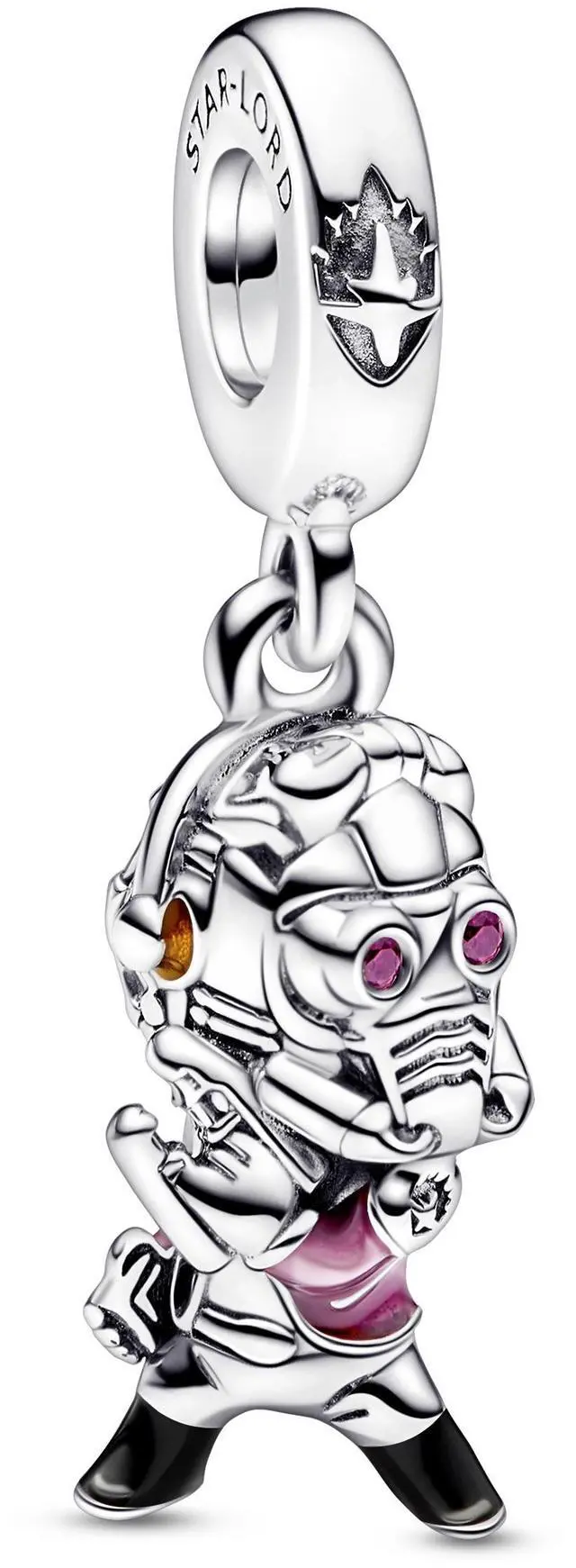 Crafted in sterling silver Star-Lord is detailed with hand-applied enamel to accentuate his headphones jacket and boots. Here to save the day he holds his Quad Blaster and Walkman and wears his iconic helmet set with glowing red stones in the eyes. STAR-LORD and LEGENDARY OUTLAW are engraved on either side of the bail which is also imprinted with the Guardians of the Galaxy emblem on its front. Add Star-Lord to your Marvel x Pandora collection to bring the action into your style.