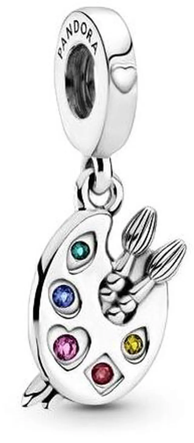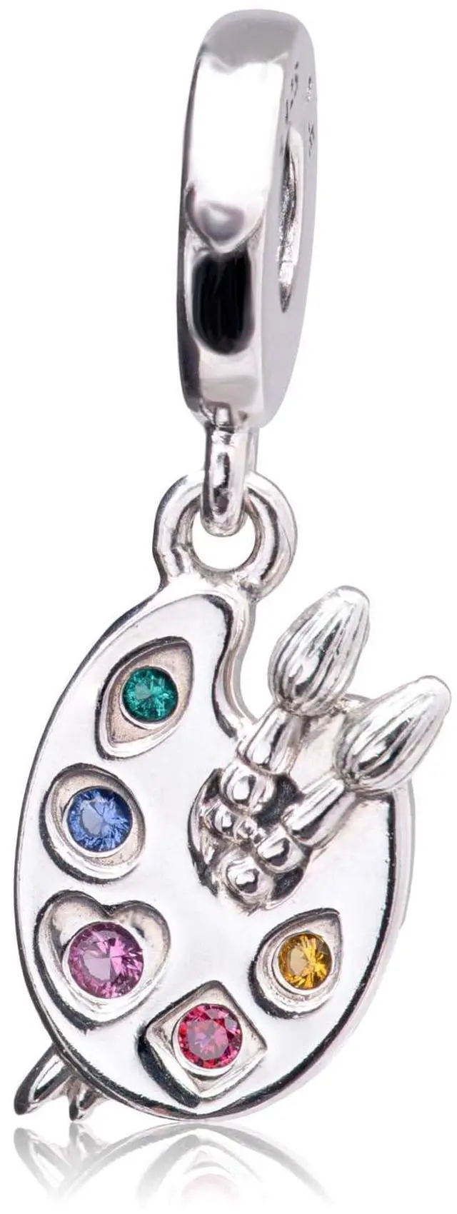 Express yourself with the Artists Palette Dangle Charm. Hand-finished in sterling silver this colourful charm represents a 3D artists palette with five vivid paint colours represented by red cubic zirconia and pink yellow green and blue crystal stones. The creative charm also features two paint brushes with bristle details and sterling silver beads at the tail. Inspired by the idea of pursuing your passions and living your life creatively let this charm be a reminder to embrace your unique point of view.
