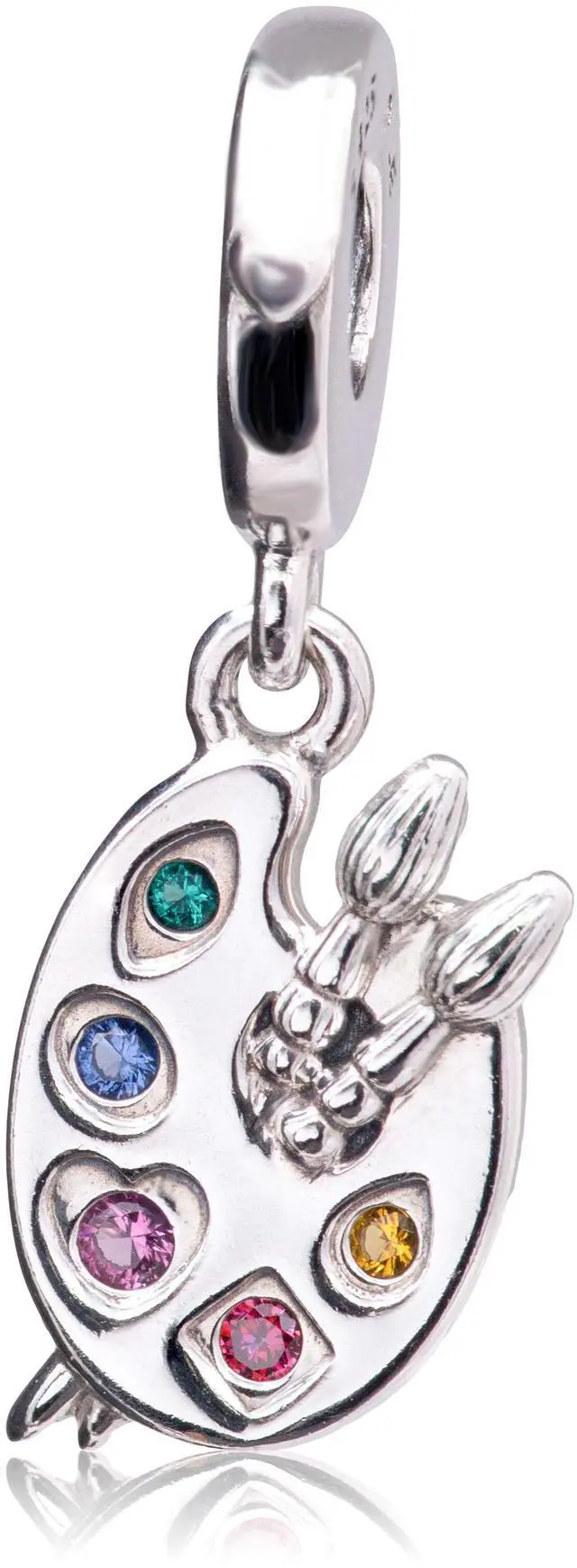 Express yourself with the Artists Palette Dangle Charm. Hand-finished in sterling silver this colourful charm represents a 3D artists palette with five vivid paint colours represented by red cubic zirconia and pink yellow green and blue crystal stones. The creative charm also features two paint brushes with bristle details and sterling silver beads at the tail. Inspired by the idea of pursuing your passions and living your life creatively let this charm be a reminder to embrace your unique point of view.