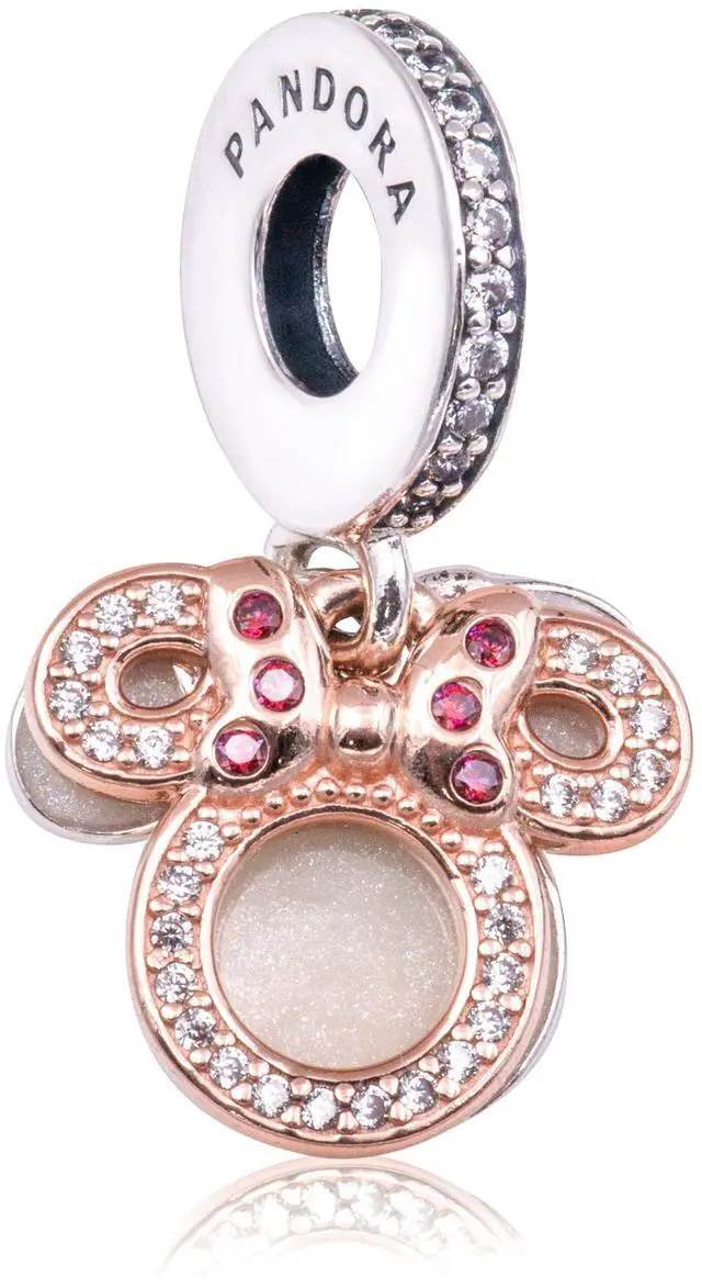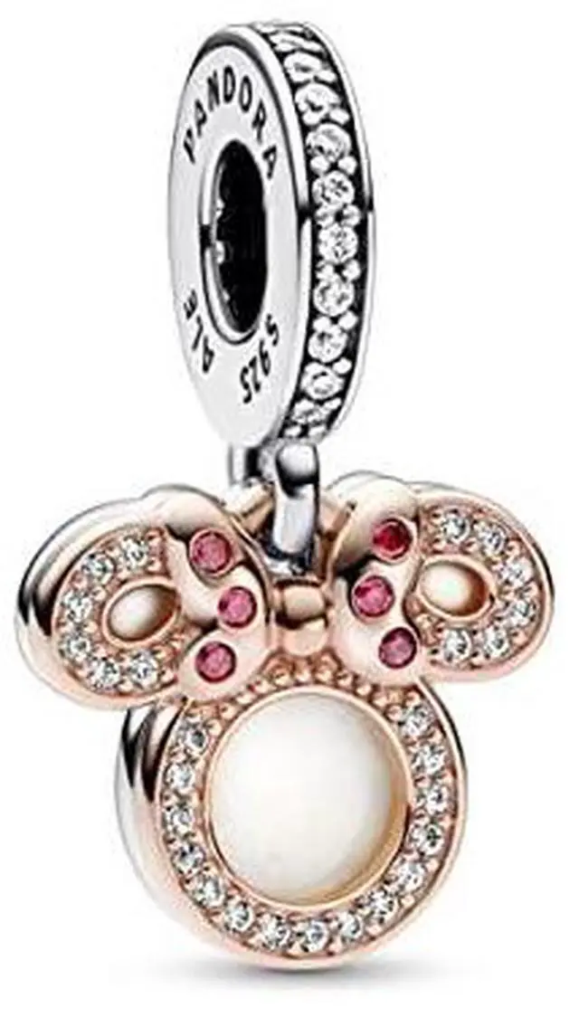 Celebrate a mom whos your best friend with Disneys Minnie Mouse. The Disney Minnie Mouse Silhouette Double Dangle Charm features two discs shaped like the iconic Minnie Mouse head silhouette - at the front is an openwork silhouette in 14k rose gold plating set with glittering clear pave and finished with Minnies signature bow with red cubic zirconia stones. Behind it is a sterling silver dangle engraved with the message Mom you are my best friend with a cut-out Minnie Mouse silhouette to represent the o in Mom with the other side covered in shimmering white enamel.