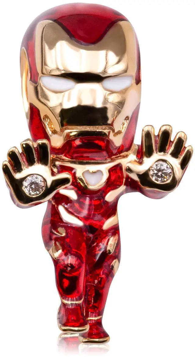 Manifest strength with the MARVEL x Pandora The Avengers Iron Man Charm! A striking combination of bright red enamel and 14k gold plating decorate Iron Mans iconic suit while white enamel is painted on his eyes. Sparkling cubic zirconia stones are set into his outstretched palms and the back of his helmet is engraved with the message Find your power.