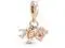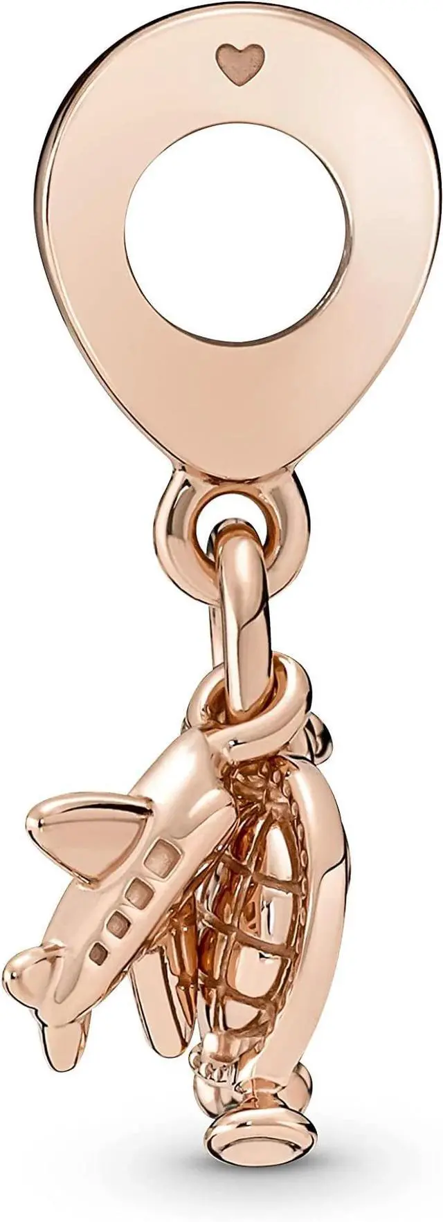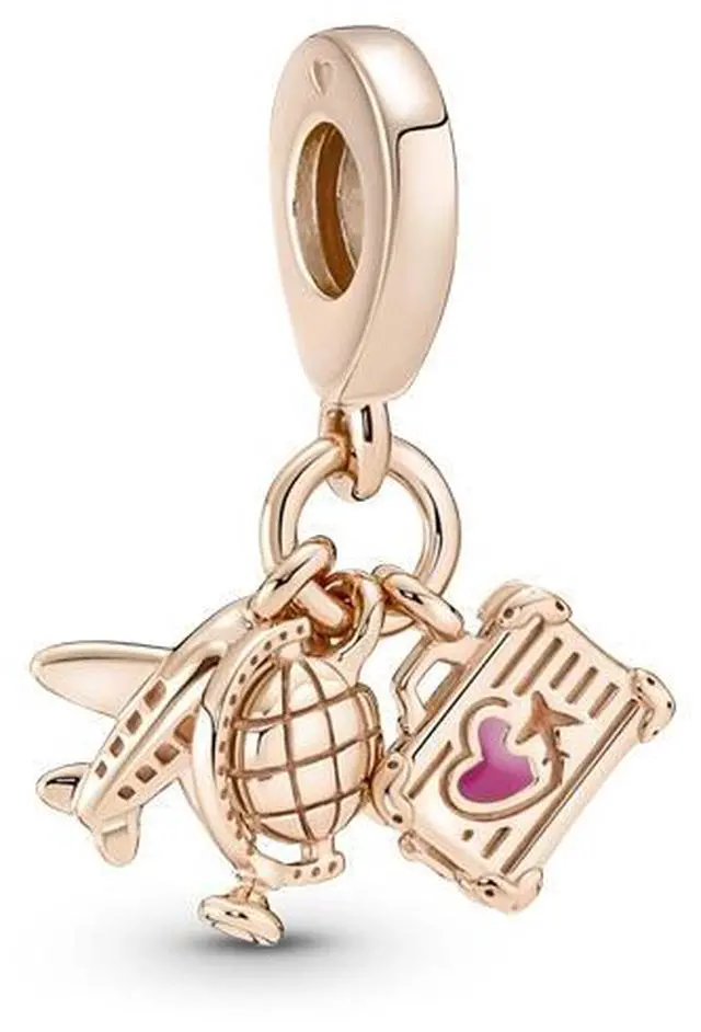 Fly away on a dream adventure with this 14k rose-gold plated travel charm. This triple dangle charm features three symbols of travel- an airplane a globe and a suitcase with lifelike corner details and a tiny pink enamel heart. Style it on your Pandora Moments pieces to carry your travel memories with you and look forward to new adventures.
