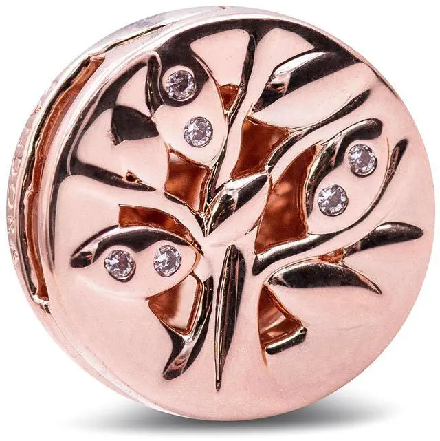 Keep your loved ones close with the family tree clip charm from the Pandora Reflexions collection. Hand-finished in Pandora Rose 14k rose gold-plated unique metal blend the family tree charm features openwork design and cubic zirconia on the front and a Family engraving on the back so you can change it up depending on your mood. The family tree serves as a reminder of the lasting bonds we have with our nearest and dearest and makes for a meaningful gift.