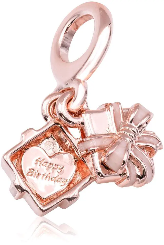 A sweet gift to make your loved ones birthday even more special. The Openable Birthday Gift Dangle Charm is finished in warm 14k rose gold plating and is shaped like a gift box with a soft pink enamel ribbon and bow. Open the box and youll discover a raised heart with the engraved message Happy Birthday. A special jewelry gift they can wear all year to remember that birthday glow.