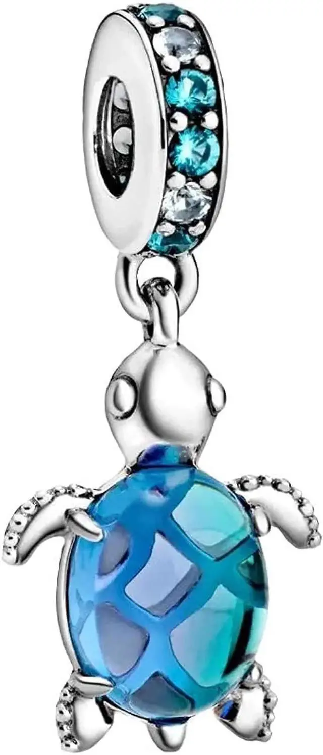 The Murano Glass Sea Turtle Dangle Charm is inspired by the peaceful creatures of the deep blue sea. The sea turtle charm features bleached aqua blue crystals icy green crystals and a single peacock Murano glass bead. The sterling silver cut-out pattern on the belly of the turtle features a heart and shines through the Murano glass to create a beautiful scale-like effect that dances with the light.