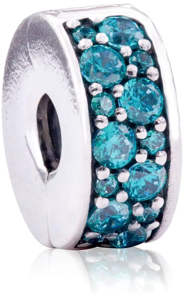 Add balance and beauty to your bracelet with our sterling silver clip charm hand-finished for a human touch. Its been lovingly pave-set with teal-colored cubic zirconia that lend subtle sparkle to your look. Clip multiples onto your Pandora Moments bracelet to create a symmetrical styling - or just add one. Your mood sets the tone. This clip charm features a silicone grip does not fit onto threads (two raised charm dividers). This charm can be styled anywhere else on the bracelet.