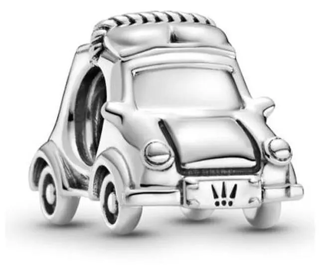 Wear your love of eco-conscious travel with the Electric Car Charm. Hand-finished in sterling silver this car charm includes realistic details like a spare wheel side mirrors hood front light and a stamped battery on the underside. Stylistic details include license plates with partial Pandora monogram and a back plate with the word LOVE where the O is a red enamel heart as well as an oxidised grooved rope holding a raised heart on the roof.