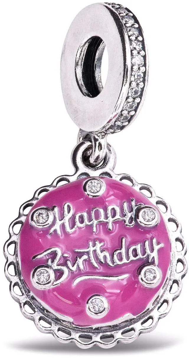 Say Happy Birthday with this sterling silver Pink Birthday Cake Dangle Charm. Celebrate the special day with a cake charm that will keep you in festive spirits all year round. The dangle features a hand-applied pink enamel design and clear cubic zirconia dotted around representing candles. The raised Happy Birthday script on the front dangle is joined by a candle symbol engraving and the message Make a wish! on the back. Make any birthday one to remember with this celebratory charm.