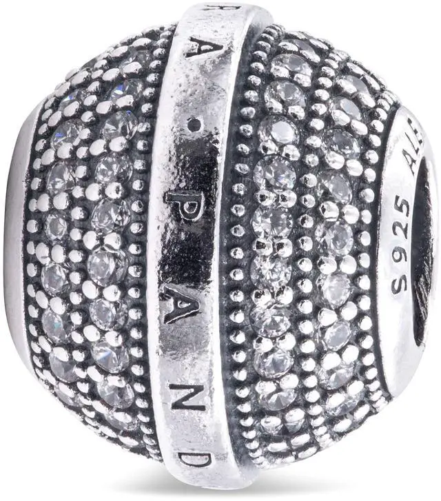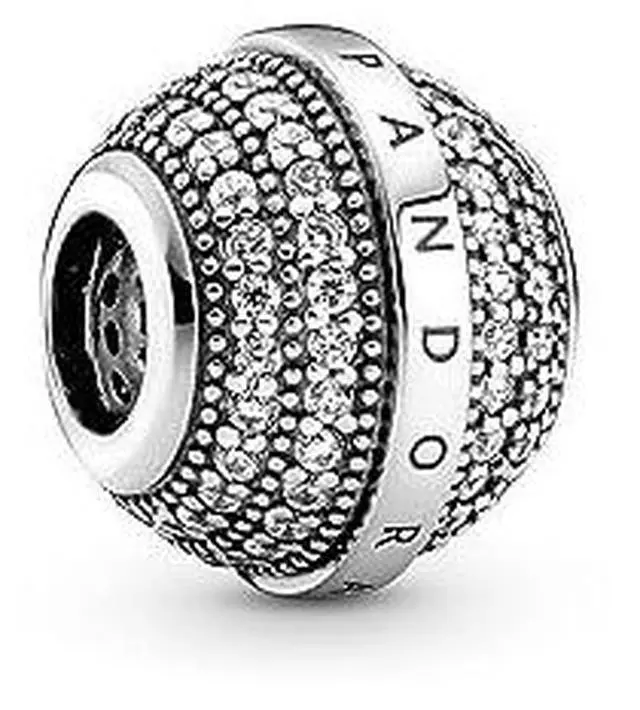 Make your everyday outfits shine with the Pave & Logo Charm. Hand-finished in Sterling Silver this charm features four rows of brilliant-cut clear cubic zirconia pave separated in the middle by a raised polished row with two Pandora logos. Each row is also framed by micro-beading adding another cool element of texture to this detailed charm. Encapsulating modern sophistication this round charm makes a bold sparkling addition to any look.