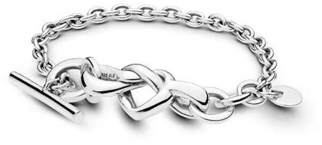 The love bracelet channels the symbolism of the knot a a longstanding symbol of love connection and unbreakable bonds. Hand-finished in sterling silver the T-bar design features oversized links and a knotted heart centrepiece for a chunky finish. The bracelets heart-embellished toggle glides through the largest link to open and close. Wear it to tell your style story without charms or layer it together with your favourite bracelets.