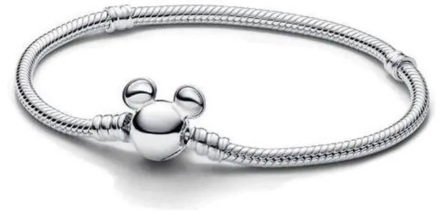 Style your Disney x Pandora charm collection on the Disney Mickey Mouse Clasp Moments Snake Chain Bracelet. This sterling silver snake chain bracelet features a clasp inspired by the iconic Mickey Mouse head silhouette. Press Mickeys ears in opposite directions to easily open and close the clasp. The bracelet has two threaders (raised charm dividers) and can hold 16-18 charms or dangle charms. The perfect way to showcase your Disney favorites.