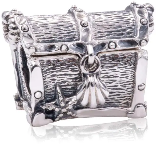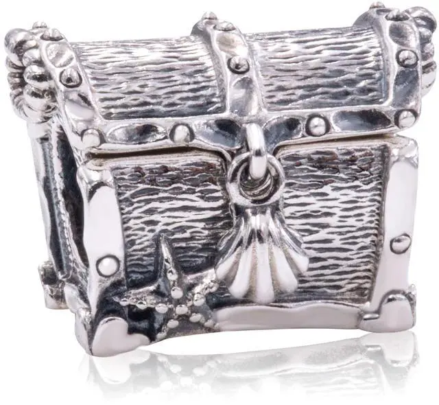 Embrace your sense of adventure with the Pandora Moments Chest of Treasure Charm. Hand-finished in sterling silver this box charm features a lid that opens with a delicate seashell closure and is accented by rope-textured handles. Starfish adorn the front and back and heart-shaped feet rest at the corners of the chest. Engraved with Treasure every moment and a hidden heart inside this charm is a reminder that each day holds a memory to cherish.