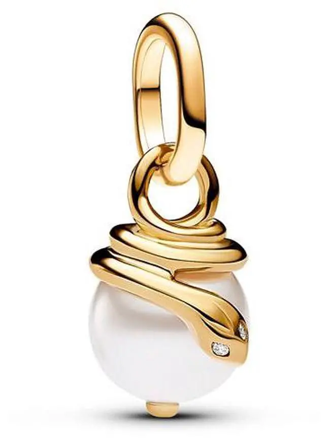 Fuse elegance and edginess with the Pandora ME Snake Pearlescent Mini Dangle Charm. A 14k gold-plated snake wraps around the top of a lacquered artificial pearl its head slightly separated from its body. The snakes head features grooved detailing and sparkling stones as eyes. A symbol of transformation and healing wear this snake charm as a reminder of who you have been and who you can become at any moment. Can only be styled on openable links.