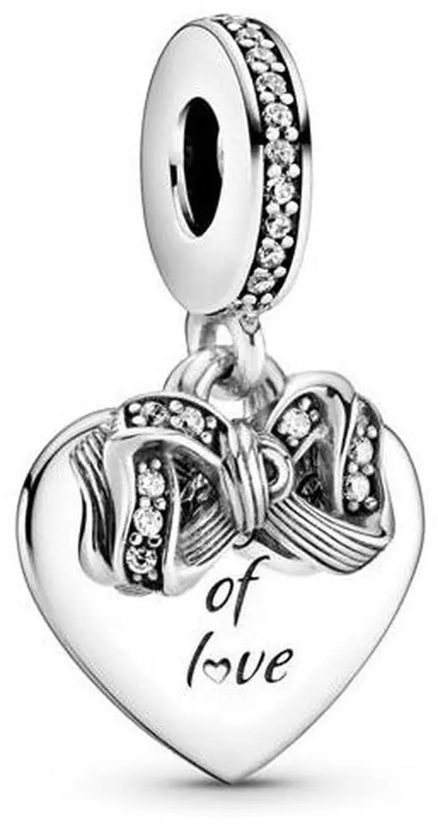 Celebrate the power of love with the Bow & Love Heart Dangle Charm. This design is hand-finished in sterling silver and features a small dangling bow decorated with clear glittering stones and a flat heart-shaped disc with the engraving The gift of love. A line of sparkling stones feature on the bail. A statement addition to any Pandora Moments bracelet surprise your loved one with this special charm.