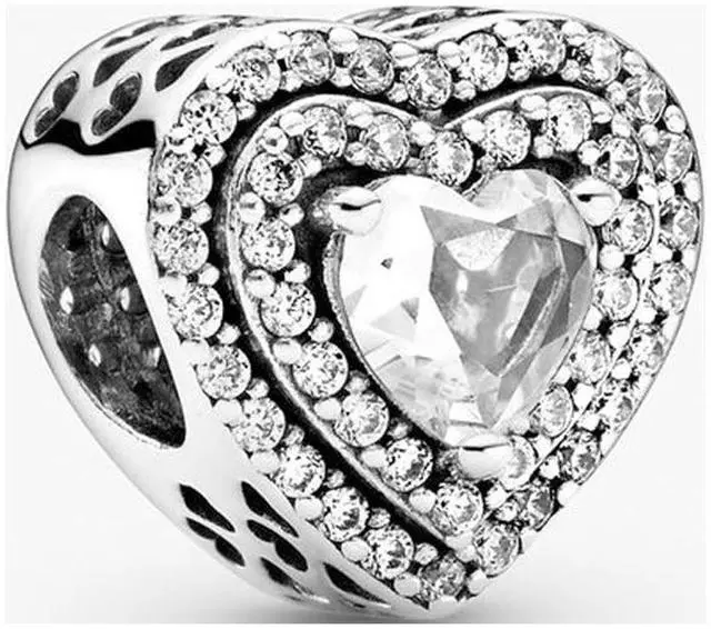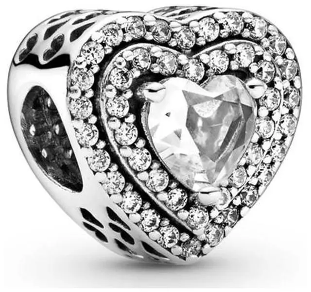 Spread the love with the Sparkling Leveled Hearts Charm. Hand-finished in sterling silver this piece is inspired by key design features from the Pandora Timeless collection. This charm features an elevated heart-shaped stone at the center outlined by two rows of clear stones. A cut-out heart pattern features on the sides. Style this piece on your go-to Pandora Moments bracelet with simple charms in sterling silver to make a sparkling statement.