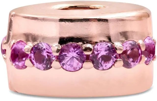 The iconic Pandora pink makes an eye-catching appearance on this sparkling clip charm. Add a pop of color to your favorite Pandora piece with the shimmer of 12 bead-set round brilliant-cut pink sapphires complemented by the warm glow of a Pandora Rose finish our 14k rose gold-plated unique metal blend. Express yourself with color and create a unique look thats uniquely you.