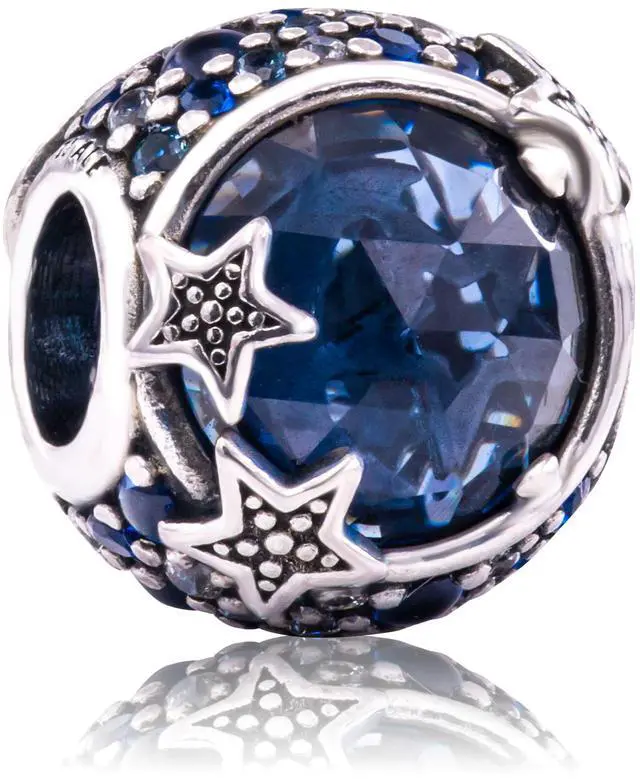 Fall for the Celestial Blue Sparkling Stars Charm. Inspired by the wonders of the night sky this piece is hand-finished in sterling silver. The rounded design includes a large blue stone in the center thats encircled by blue and clear stones in various sizes. Beaded stars overlap the central stone for added texture. Pair this charm with other shimmering celestial-inspired pieces on your favorite necklace or bracelet to carry a piece of the night sky with you wherever you go.