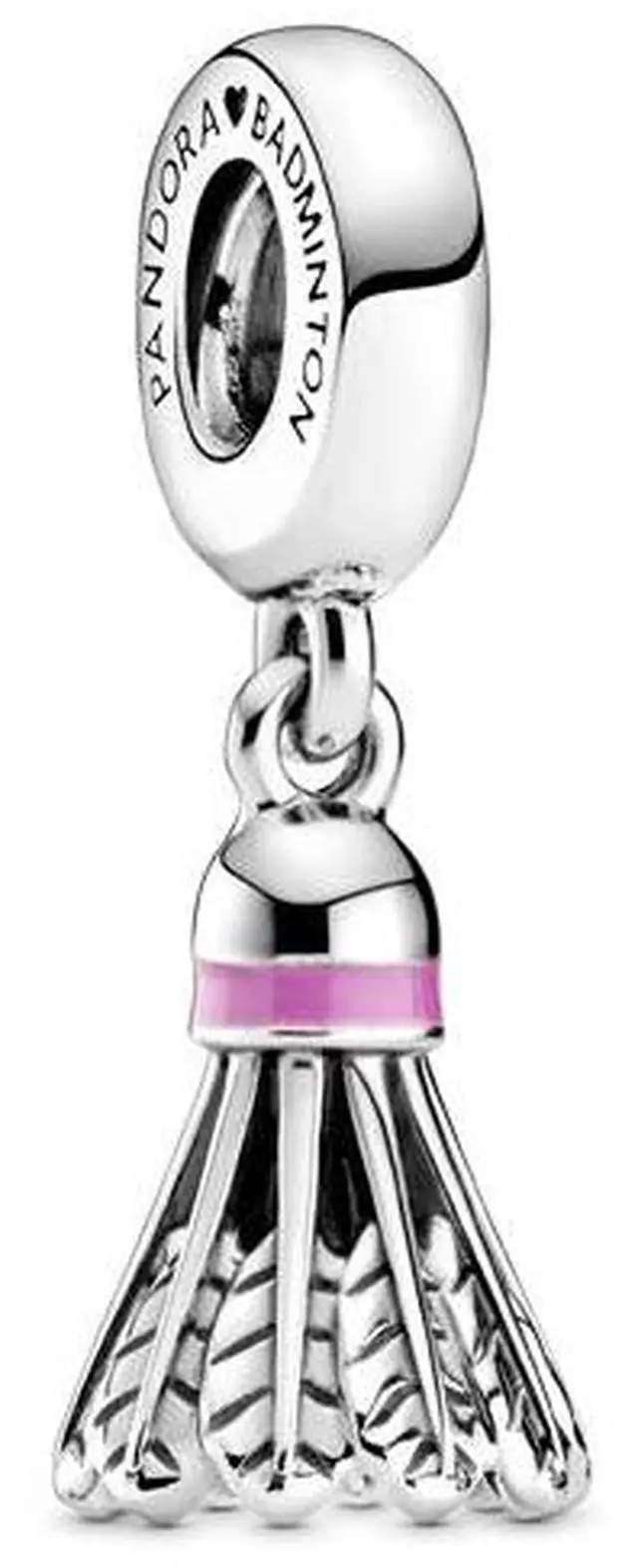 Show off your love for the game with the Badminton Birdie Dangle Charm. Featuring openwork feathers on the base and a tiny embossed heart on the underside of the cork this detailed badminton charm is hand-finished in sterling silver with ibis rose hand-applied enamel touches and a Pandora loves badminton engraving. Pair it with other Pandora charms that represent your favorite sports and hobbies and enjoy the playful charming flair it brings to your look.