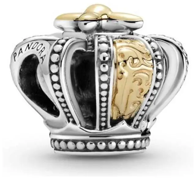 Accessorise like a royal with the Two-tone Regal Crown Charm. Hand-finished in sterling silver and 14k gold this charm features a four-sided 3D crown with a 14k gold marquise-shaped flower on top and two 14k gold sides with swirling details and a floral pattern. Micro beading along the edges and a gold hallmark stamp disc on the bottom makes this intricate and ornate crown charm even more eye-catching. Wear it to bring an elegant and regal flourish to any look.