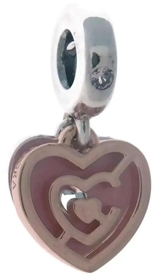 Labyrinth heart dangle in PANDORA Rose and sterling silver with 2 flush-set blush pink crystals powder pink enamel and engraving - Follow your heart. A mix of hearts metals and pink create a style recipe of love. Move the PANDORA Rose labyrinth heart to the side to see a cut-out heart in the sterling silver and enamelThis dangle shows you follow your heart.