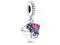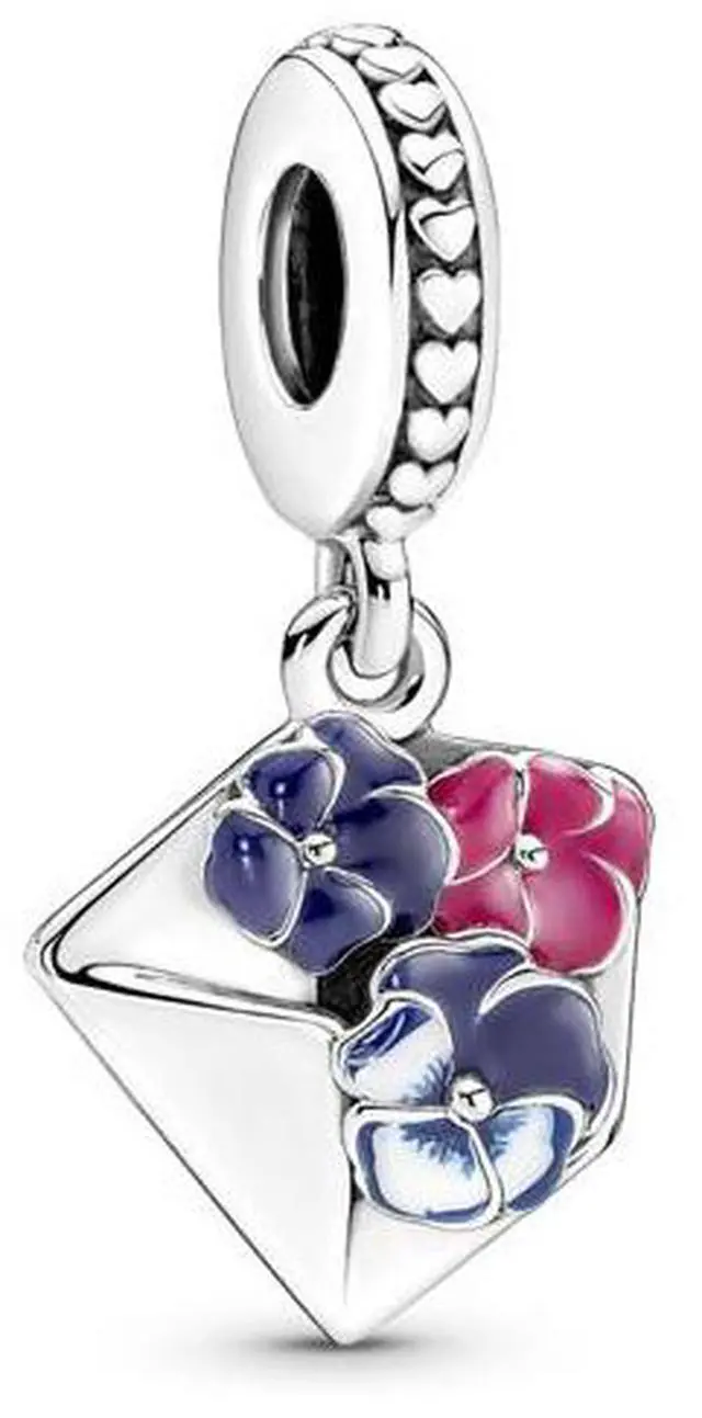Send a sweet smelling letter with the cute Pansy Flower Envelope Dangle Charm! This sterling silver letter is filled with colourful hand-painted pansies in pink and blue enamel. The front of the envelope includes a tiny postage stamp franking lines and is addressed From me to you. Embossed hearts form a line around the slim bail.