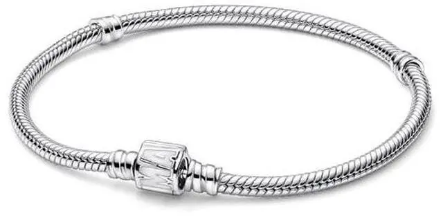 Build your dream team. Hand-finished in sterling silver this legendary bracelet features our iconic snake chain pattern and a Marvel logo brick clasp detailed with slightly raised letters in white enamel. It can hold up to 18 charms dangle charms or pendants. Simply add a clip charm on each thread to divide it into three sections and then choose your favourite hero charms. Wear our Pandora Moments Marvel Logo Clasp Snake Chain Bracelet as an everyday reminder to find your power.