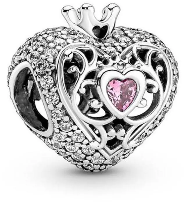 Sparkling pink cubic zirconia stone at the centre of a heart-shaped charm and a crown on top. A delicate cut-out filigree design on either side. Tiny hearts positioned above the pink stone and at base of the crown. Brilliant-cut clear cubic zirconia adorn the sides of the charm creating a majestic look.