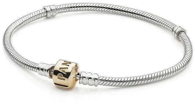 This two-tone charm bracelet featuring a sterling silver chain and 14K gold barrel clasp is a stylish way to wear your charms. Its design features our innovative threading system which makes it easy to screw PANDORA charms onto your bracelet and keep them securely where you want them.