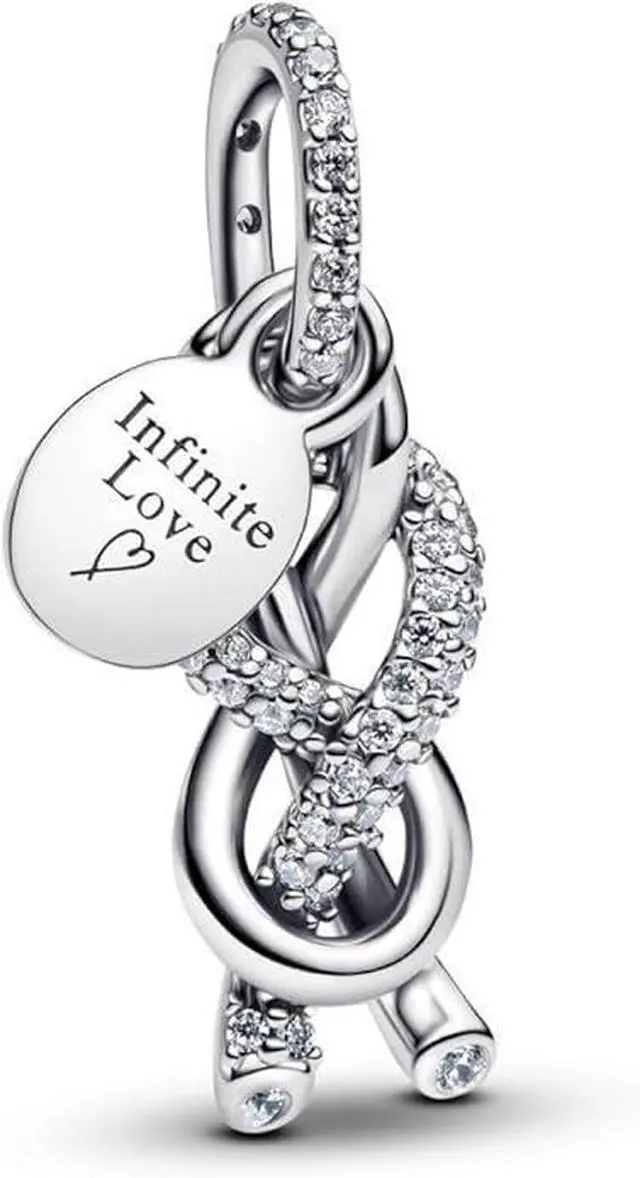 Wear a reminder that love conquers all with the Pave Infinity Knot Dangle Charm. Hand-finished in sterling silver this charm centers on an infinity knot symbol with along with disc dangle engraved with Infinite Love. Sparkling stones add a textural dimension to the front of the charm as well as the bail. A reminder that love is the most powerful force in the universe this charm is the perfect way to keep someone you love close.
