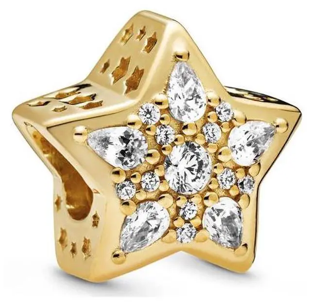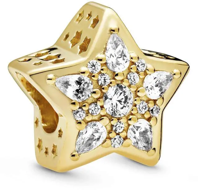 Show off your playful and cosmic sides with this Celestial Star Charm finished in Pandora Shine which is a 18k gold-plated unique metal blend. Bring the excitement of spotting shooting stars with you wherever you go. Cut-out star-shaped details on the sides add celestial charm while pear-shaped cubic zirconia on the front and back bring the sparkle. You can add multiple celestial star charms to your bracelet or necklace to represent the special people and wonderful things in your universe.